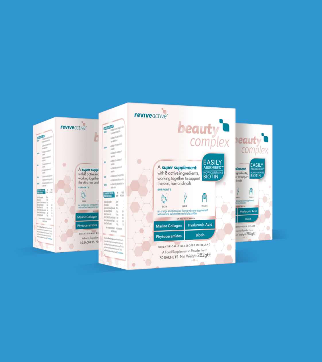 Revive Active Beauty Complex is a premium supplement scientifically developed in Ireland to nourish your skin, strengthen your hair, and support healthy nails. With 8 active ingredients, including 7,000mg of Collagen Peptides, this powerful blend works in harmony to enhance your natural beauty from within.