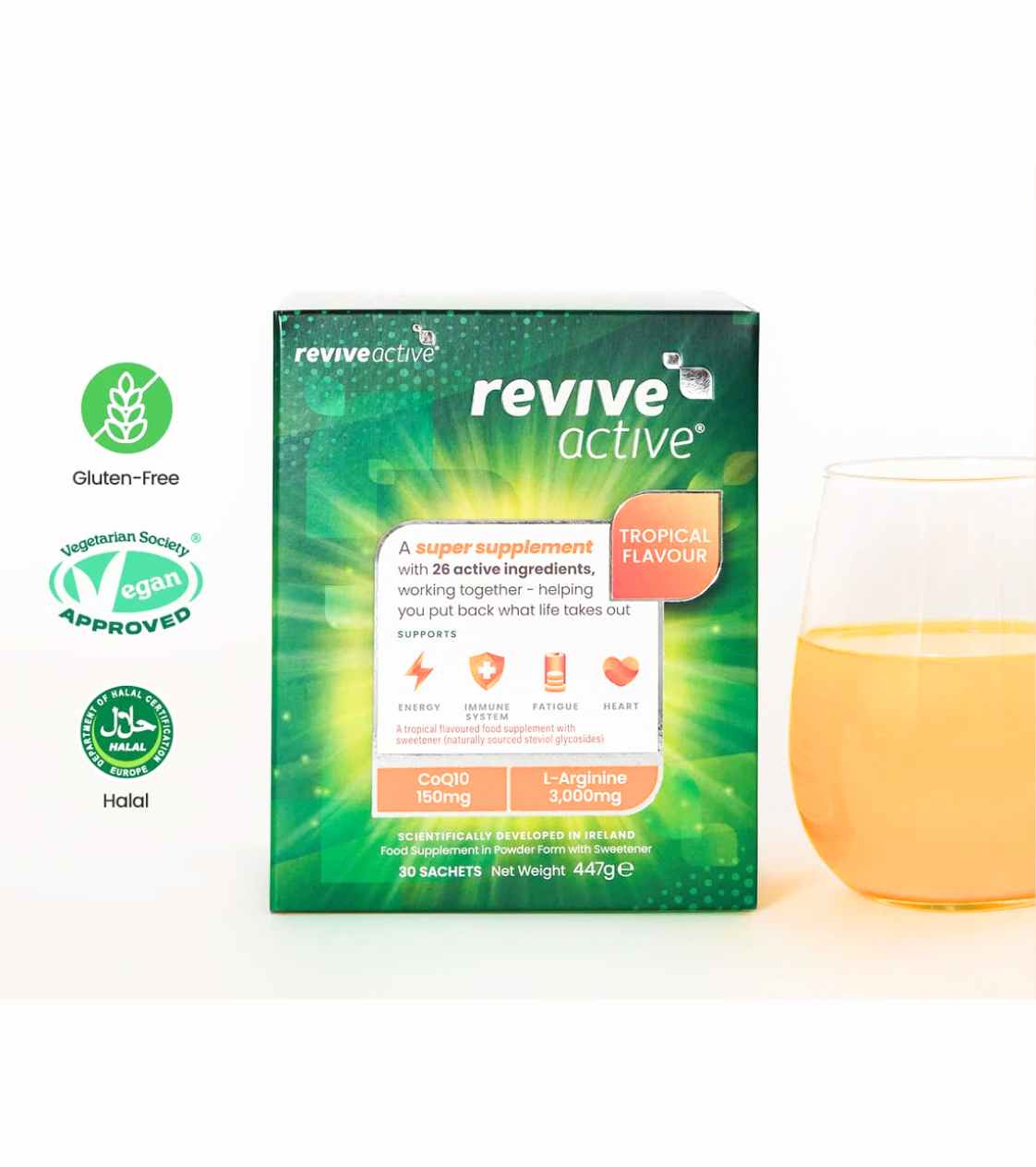 Revive Active Super Supplement – Tropical Flavour, 26 Active Ingredients, CoQ10 & L-Arginine – 30 Sachets